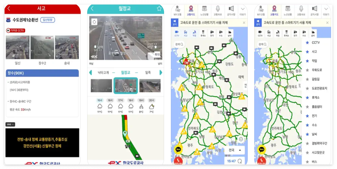 🔹고속도로와 국도의 실시간 교통정보, 공사 및 사고정보, vms 정보, CCTV 영상을 확인할 수 있습니다.